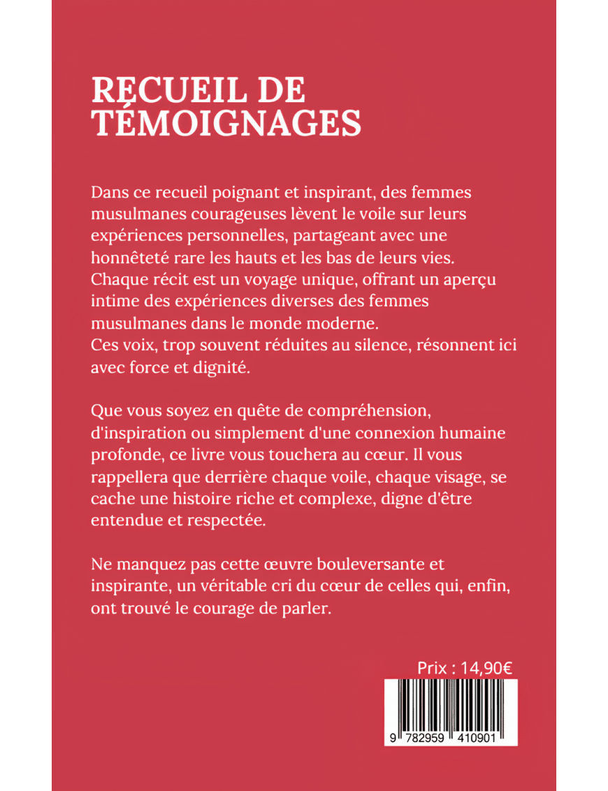 Dans ce recueil poignant et inspirant, des femmes musulmanes courageuses lèvent le voile sur leurs expériences personnelles, partageant avec une honnêteté rare les hauts et les bas de leurs vies. Chaque récit est un voyage unique, offrant un aperçu intime des expériences diverses des femmes musulmanes dans le monde moderne. Ces voix, trop souvent réduites au silence, résonnent ici avec force et dignité.