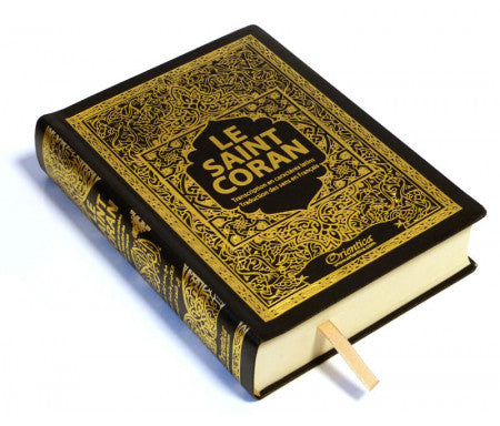 Le Saint Coran avec versets en arabe, traduction française + transcription phonétique (translittération de l'arabe en caractères latins). Impression couleur. Couverture en similicuir dorée, avec bords arrondis et marque page intégré.